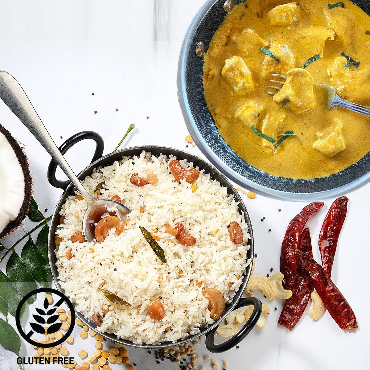 Water, Basmati Rice (28%), Coconut (9%), Coconut Oil, Chick Peas, Salt, Urad Dahl, Mustard Seeds (Mustard), Curry Leaves, Fennel Seeds, Dried Red Chillies, Cashew Nuts (Nuts) (0.01%).