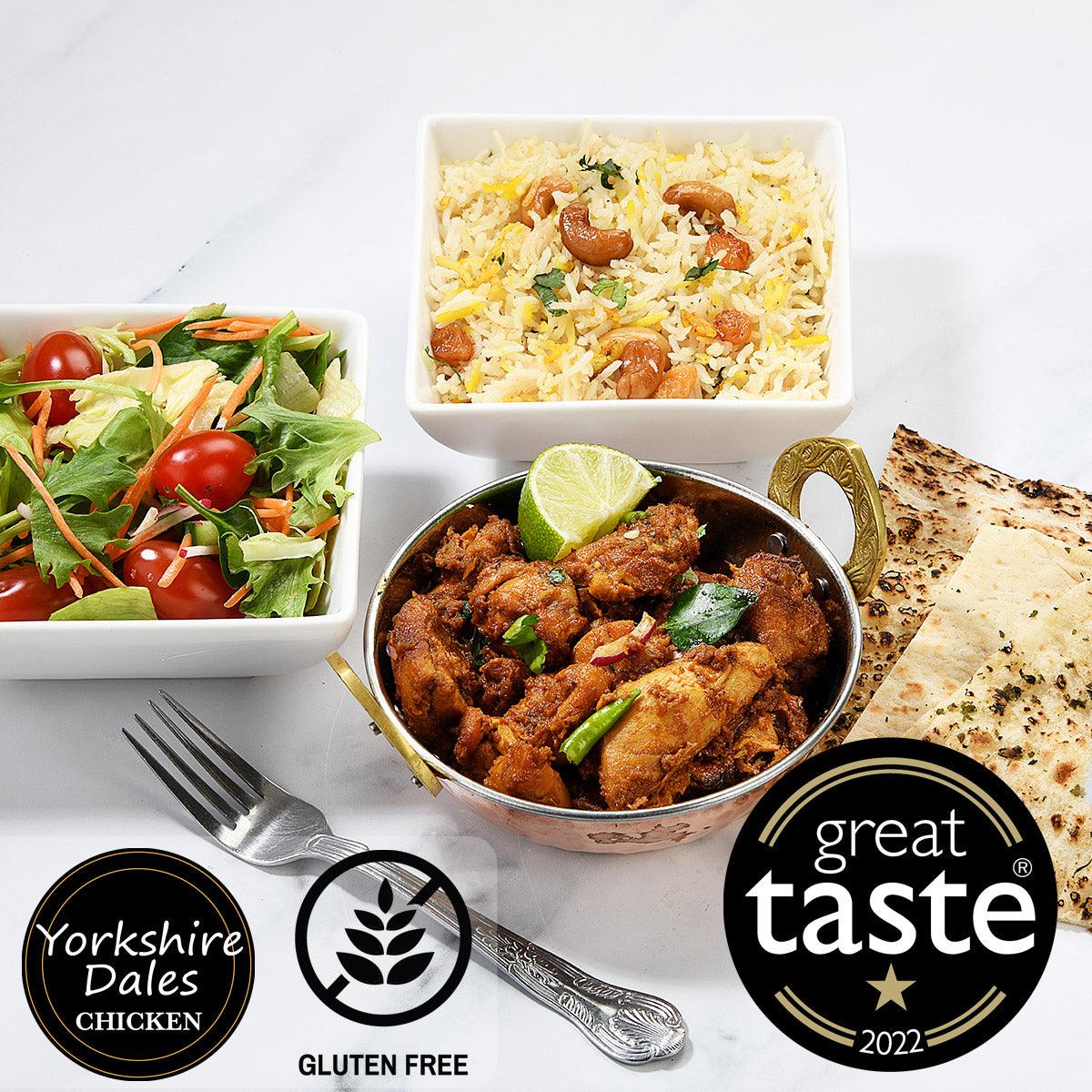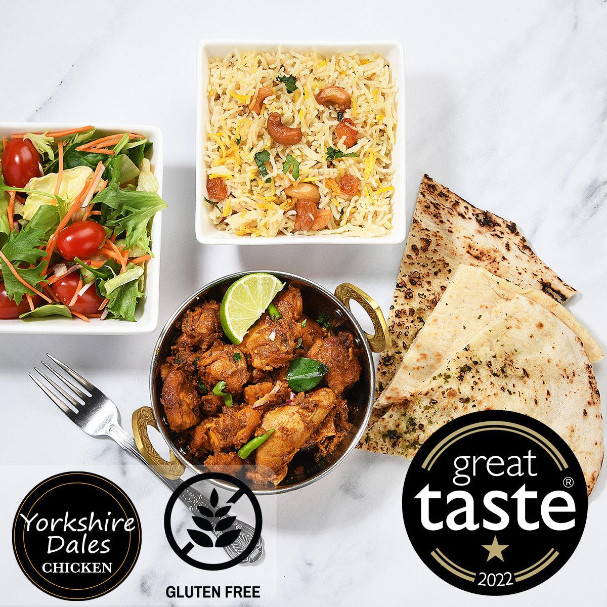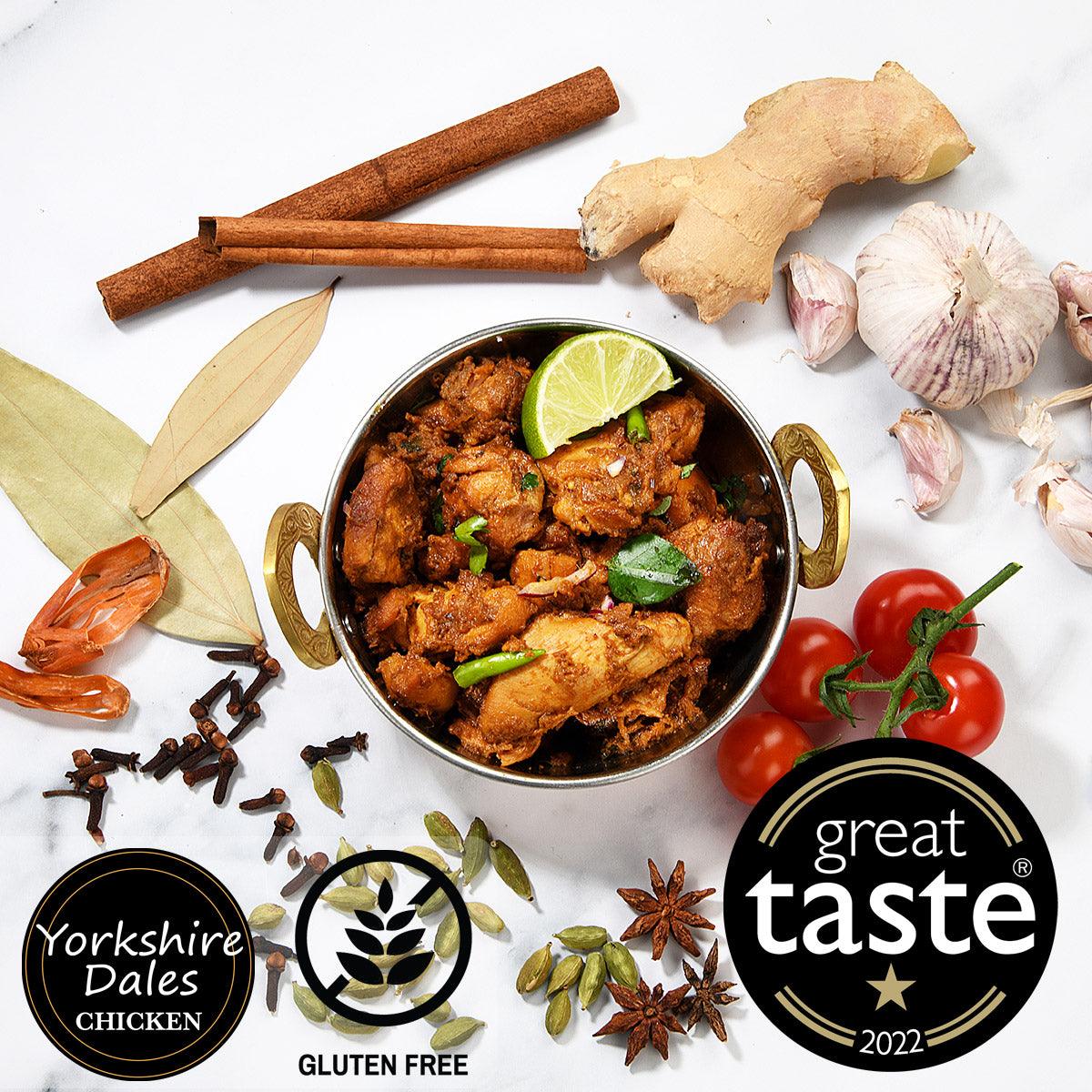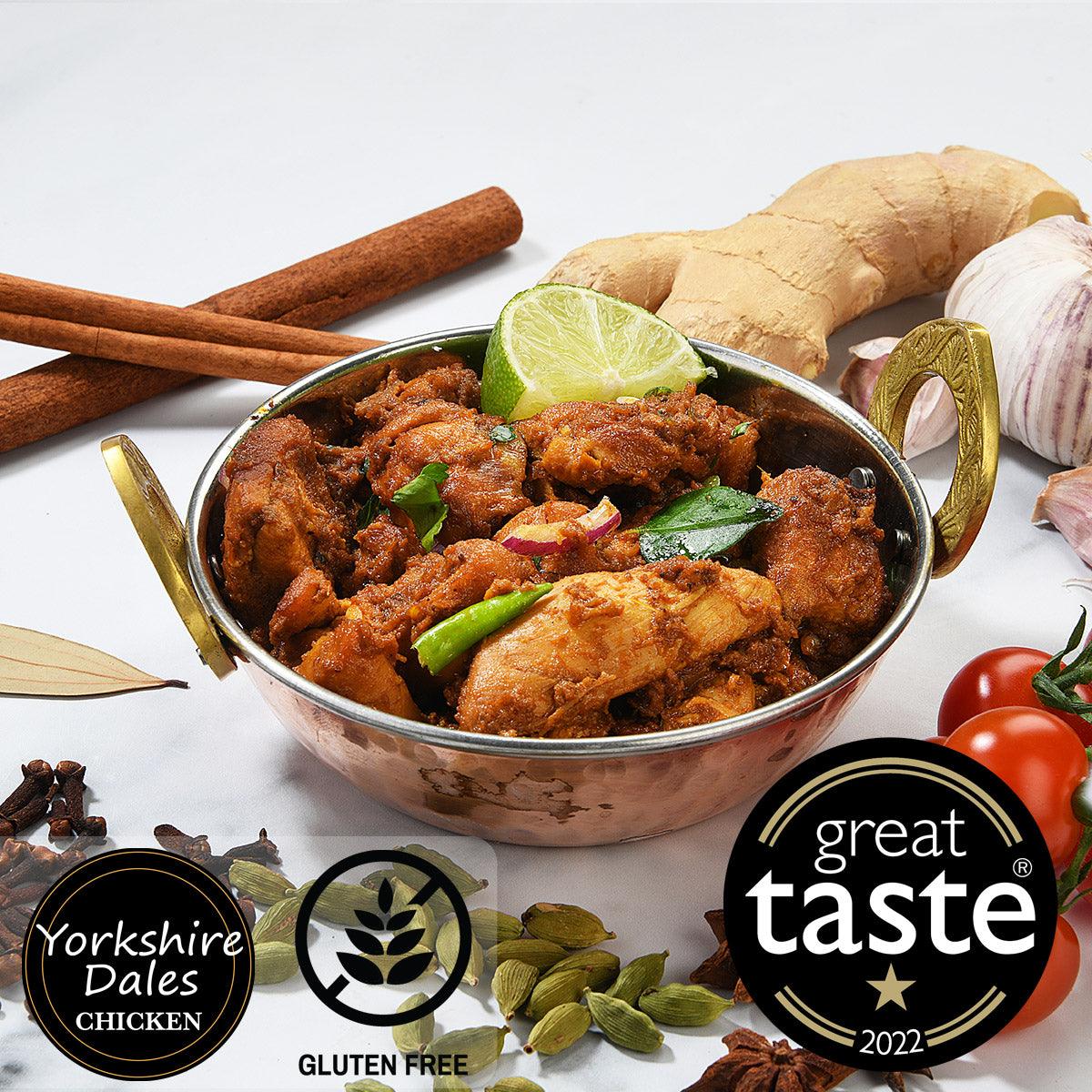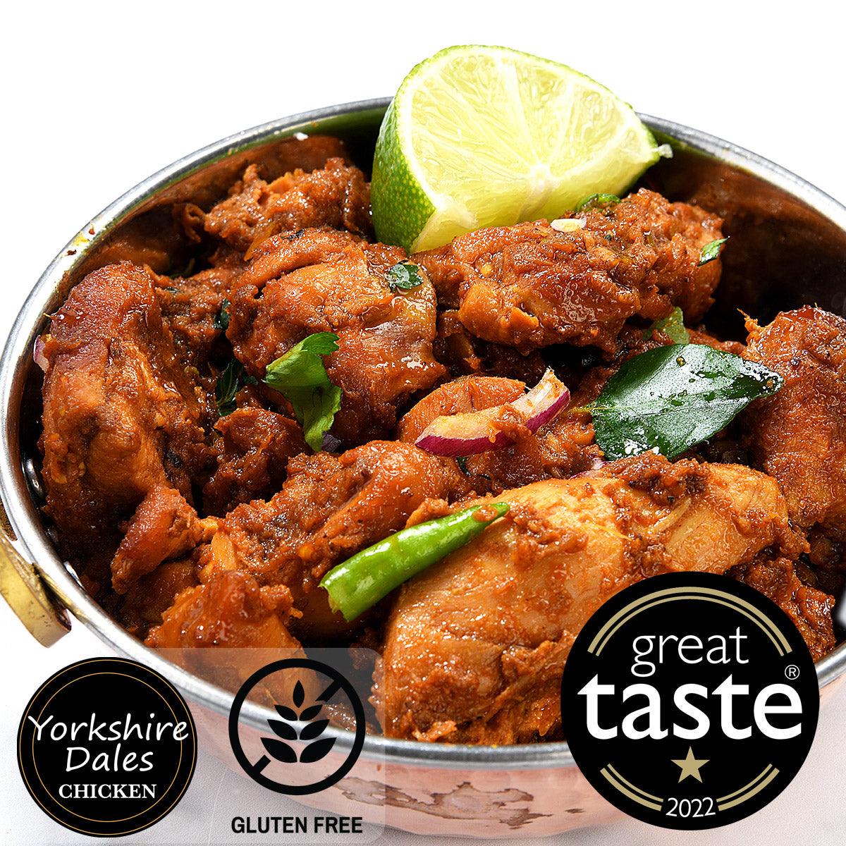 Boneless Chicken (56%), Onion, Water, Coriander Leaves, Coconut Oil, Tomato Puree, Curry Leaves (1.1%), Salt, Ginger, Garlic, Ground Coriander, Lemon Juice, Turmeric, Chilli Powder, Coconut Sugar, Fennel Seeds, Green Chilli, Black Pepper, Garam Masala, Ground Cumin, Red Chilli.