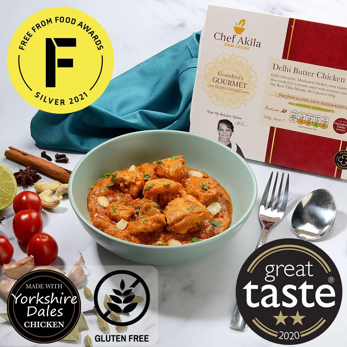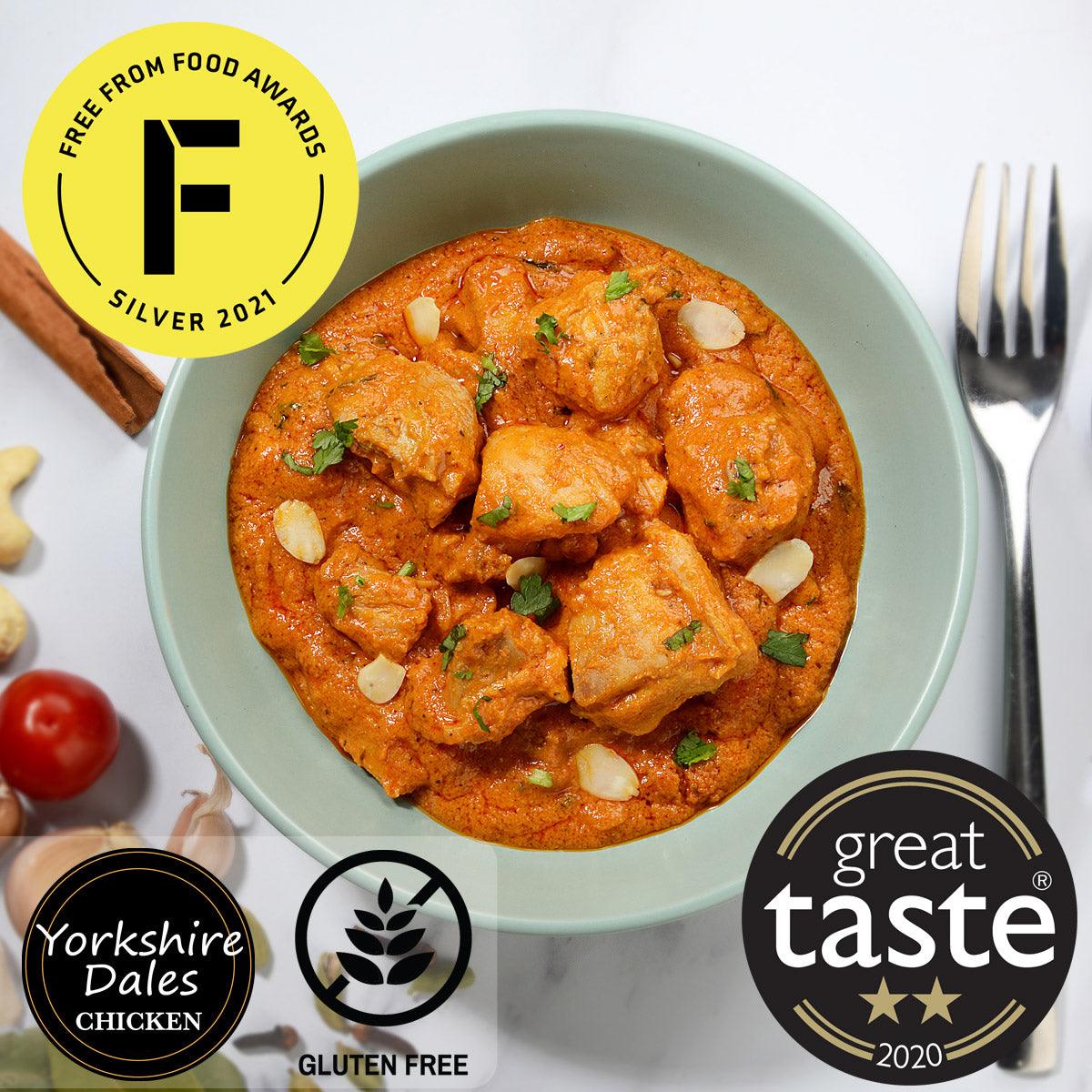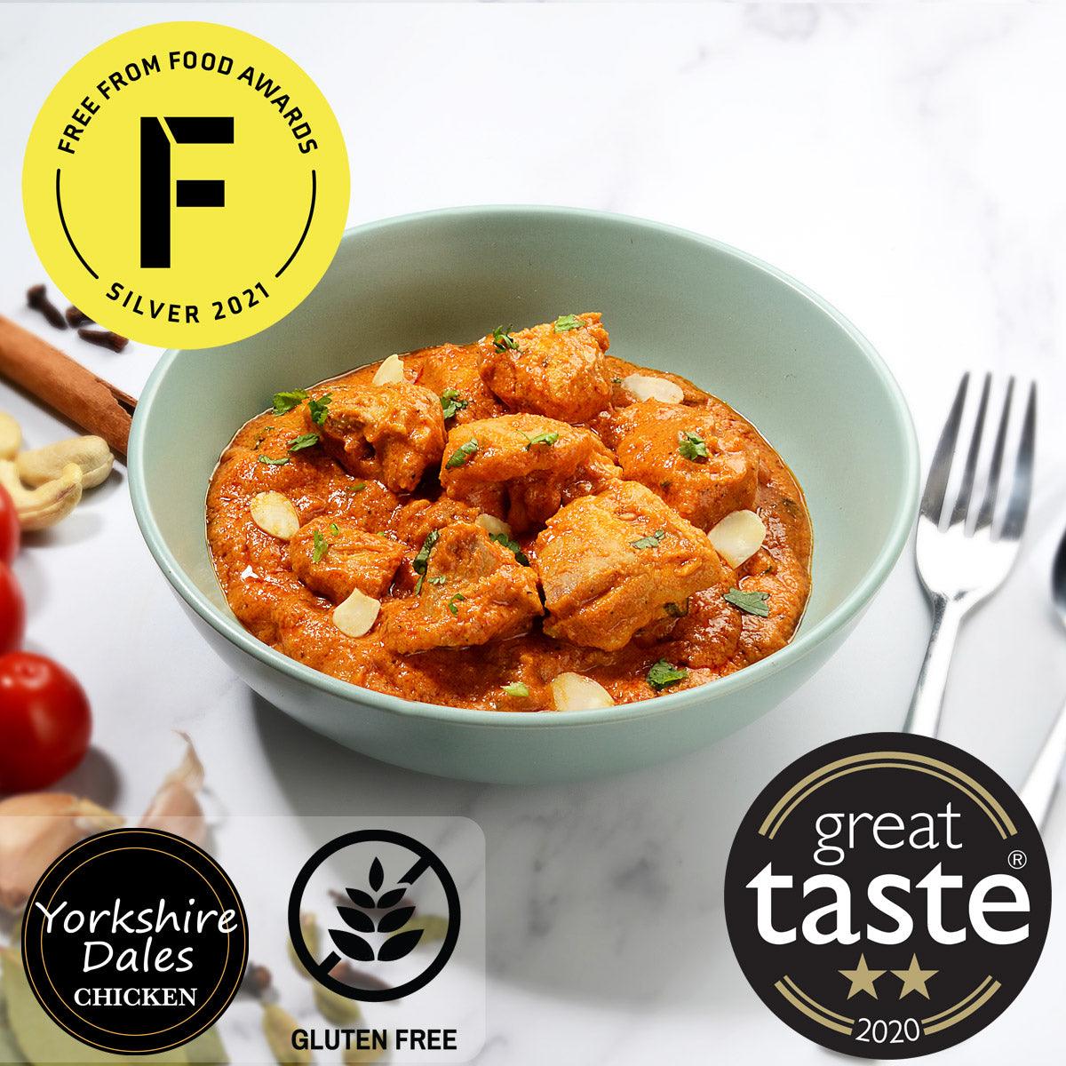 Boneless Chicken (40%), Water, Tomatoes (20%), Cream (1.6%) (Milk), Butter (Milk), Green Chilli, Garlic, Chilli Powder, Ginger, Honey, Cashew Nuts (Nuts), Garam Masala, Salt, Coriander Leaves, Cardamon, Cinnamon, Cloves, Fenugreek Leaves, Lemon Juice, Bay Leaf.