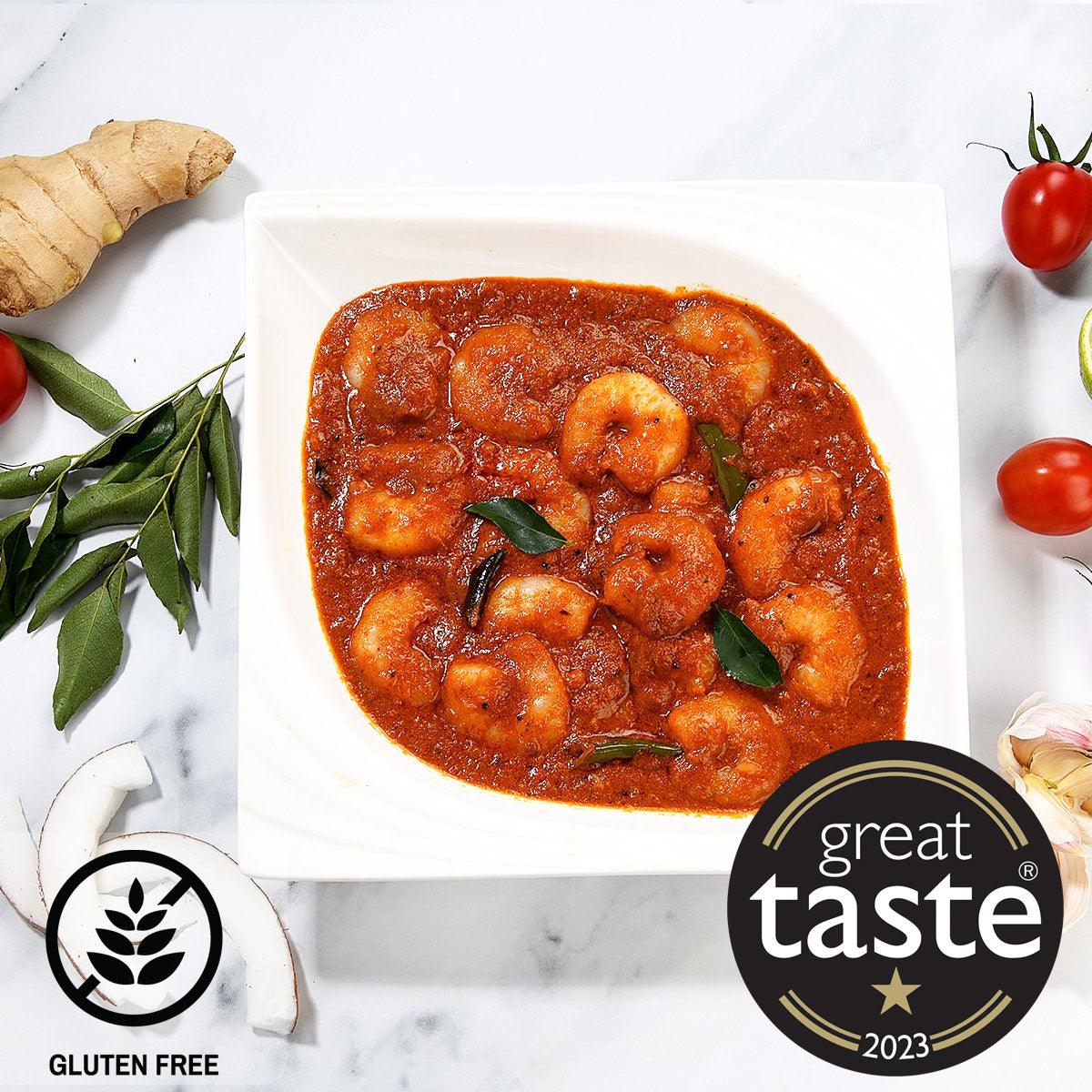 Water, King Prawns (17%) (Crustaceans), Coconut Milk (11%), Onion, Tomatoes, Coconut (2%), Coconut Oil, Ginger, Salt, Garlic, Ground Coriander, Green Chilli, Curry Leaves, Dried Red Chillies, Turmeric, Coconut Palm Sugar, Malabar Tamarind (Garcinia), Tamarind, Black Pepper, Chilli Powder, Mustard Seeds (Mustard), Fenugreek Seeds.