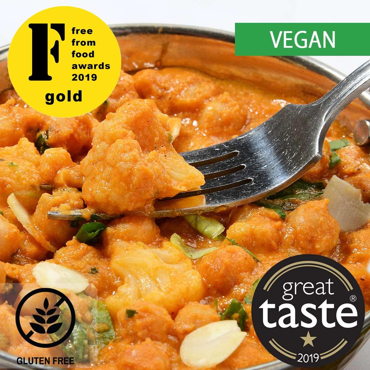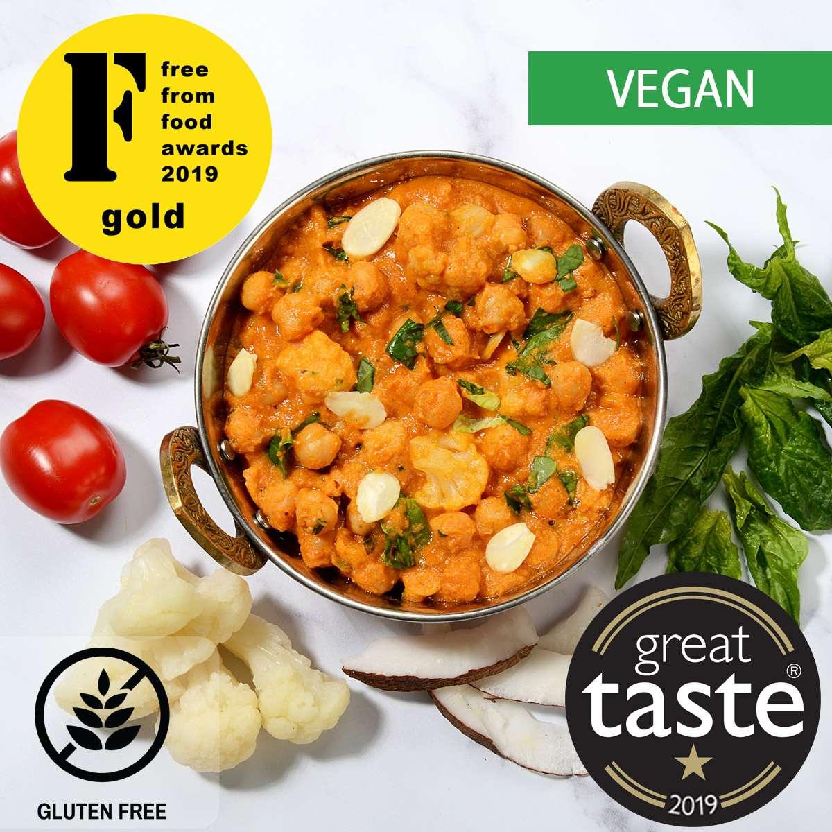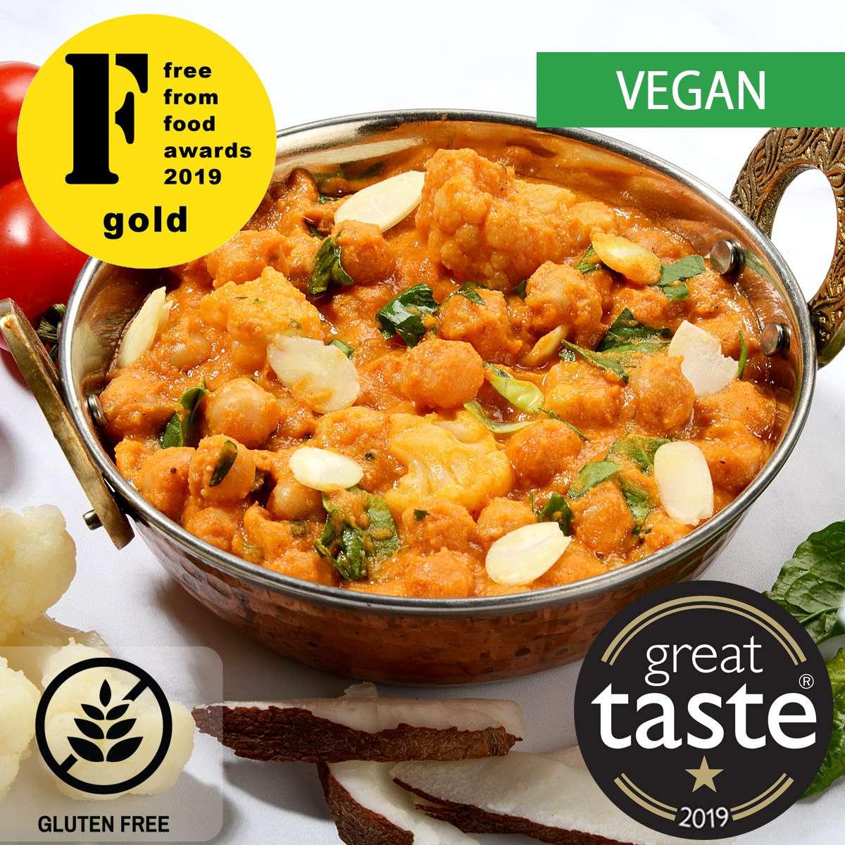 Water, Chickpeas (15%), Cauliflower (15%), Tomatoes (12%), Spinach (6%), Onion, Coconut Milk, Ground Ginger, Garlic, Cashew Nuts (Nuts), Coconut Oil, Green Chilli, Garam Masala, Coconut Palm Sugar, Ground Coriander, Salt, Ground Cumin, Cardamon, Cinnamon, Lemon Juice, Fenugreek Leaves, Almonds (Nuts).